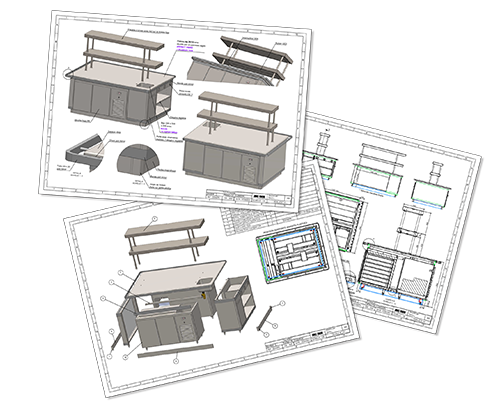 Notre bureau d'études est à votre écoute pour réaliser l'ensemble de vos projets . Nous réalisons des plans à valider avant chaque lancement en fabrication . Vous pouvez alors nous faire part de vos eventuelles modifications . Cela permet de vous livrer un produit conforme à vos attentes . Nous travaillons sur le logiciel SolidWorks , dans certains cas nous avons la possibilité de vous faire parvenir des 3D de votre meuble manipulable directement dans votre page internet . Nous sommes aussi en mesure de réaliser des rendus virtuels .